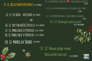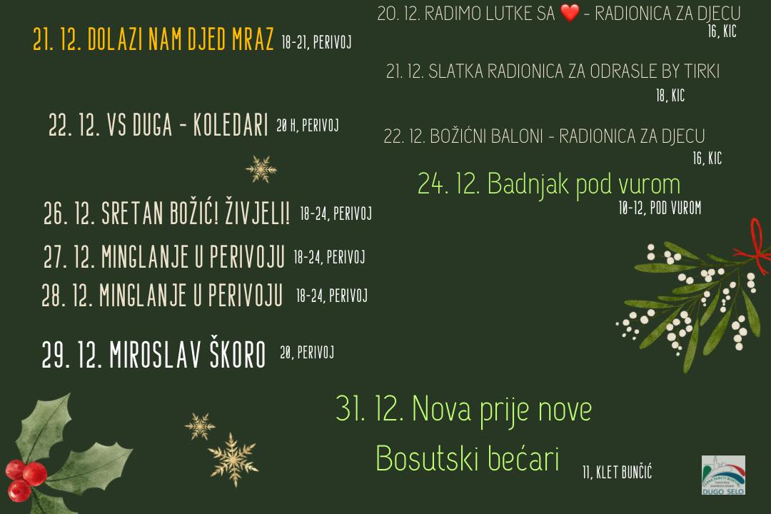 Turistička zajednica Grada Dugog Sela pripremila je bogat program za Adventsko razdoblje u Perivoju grofa Draškovića i KIC-u, a pod vurom dugoselce i posjetitelje očekuje i tradicionalni Badnjak i za kraj godine doček Nove prije Nove.